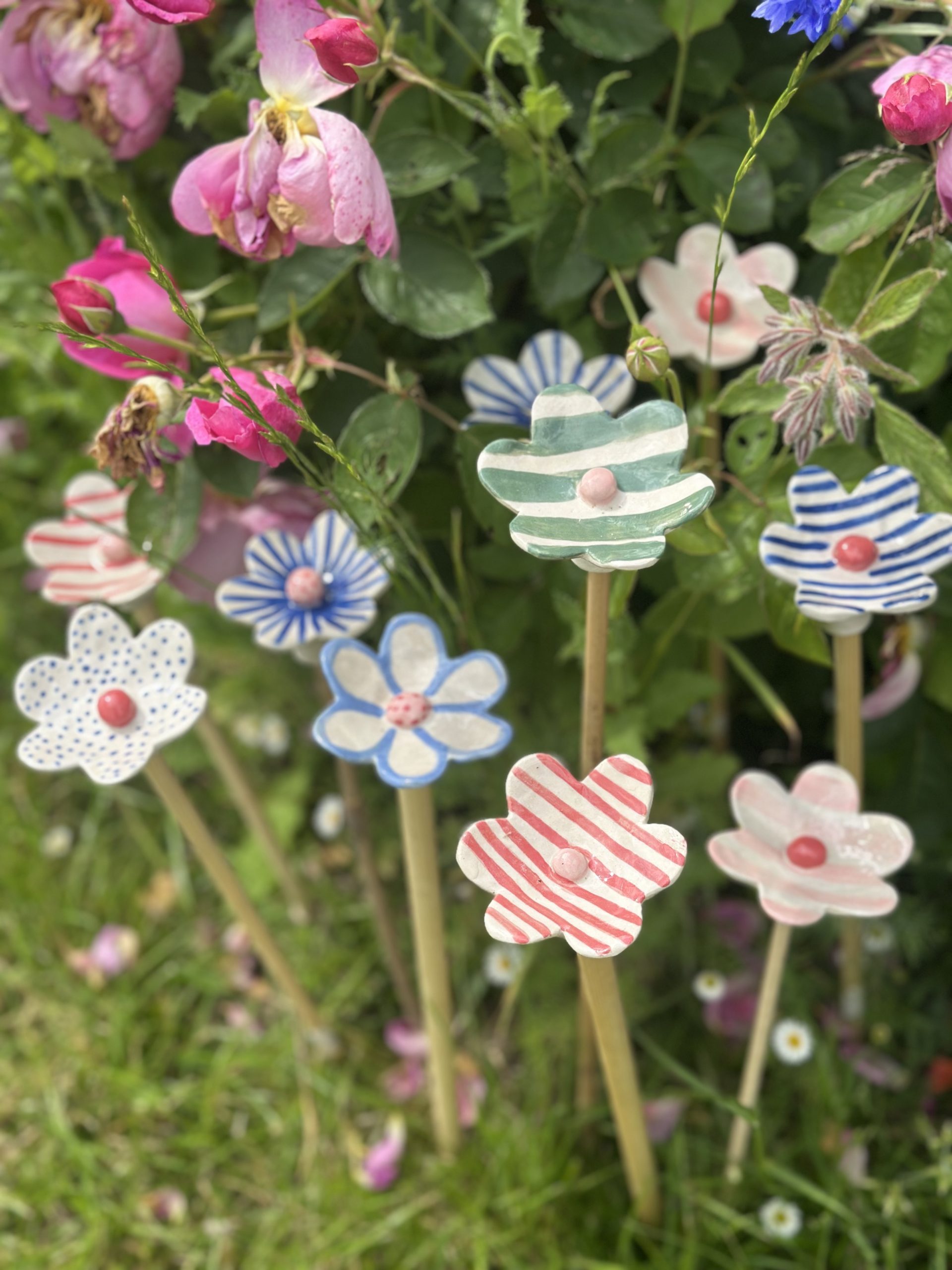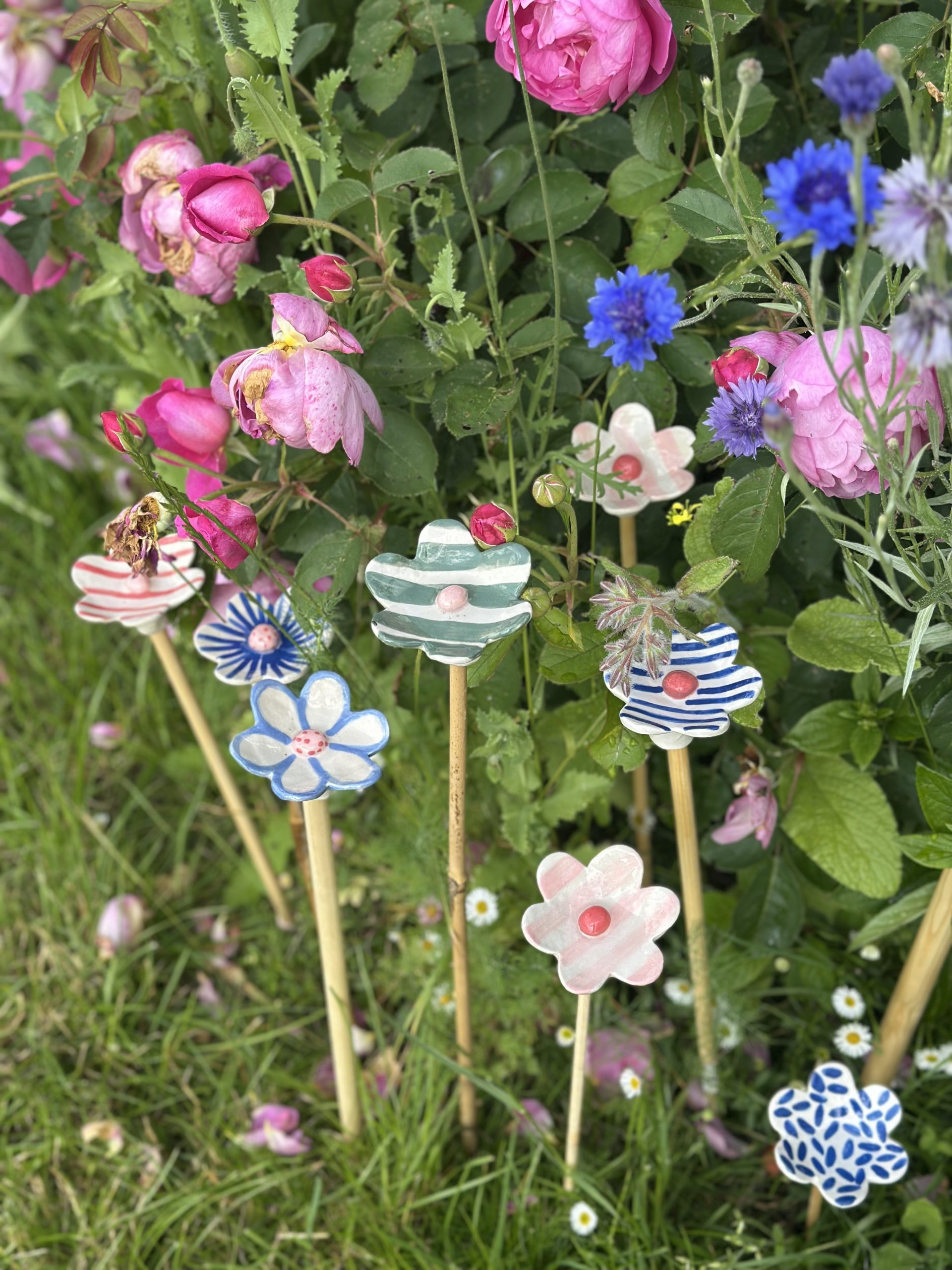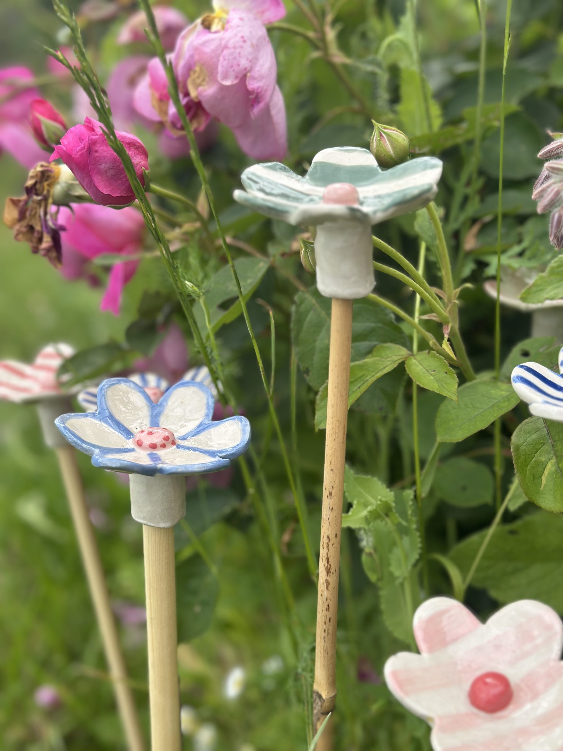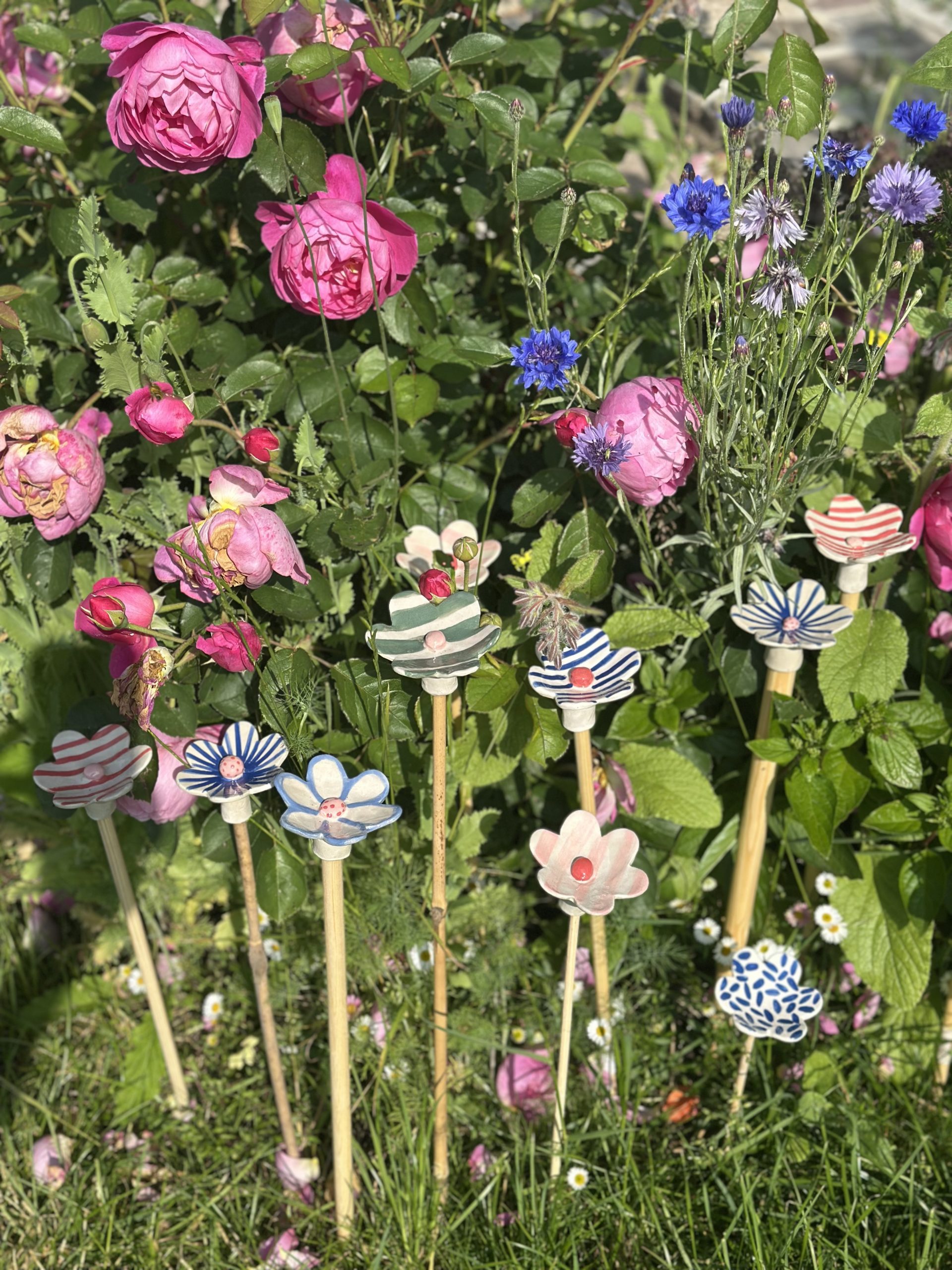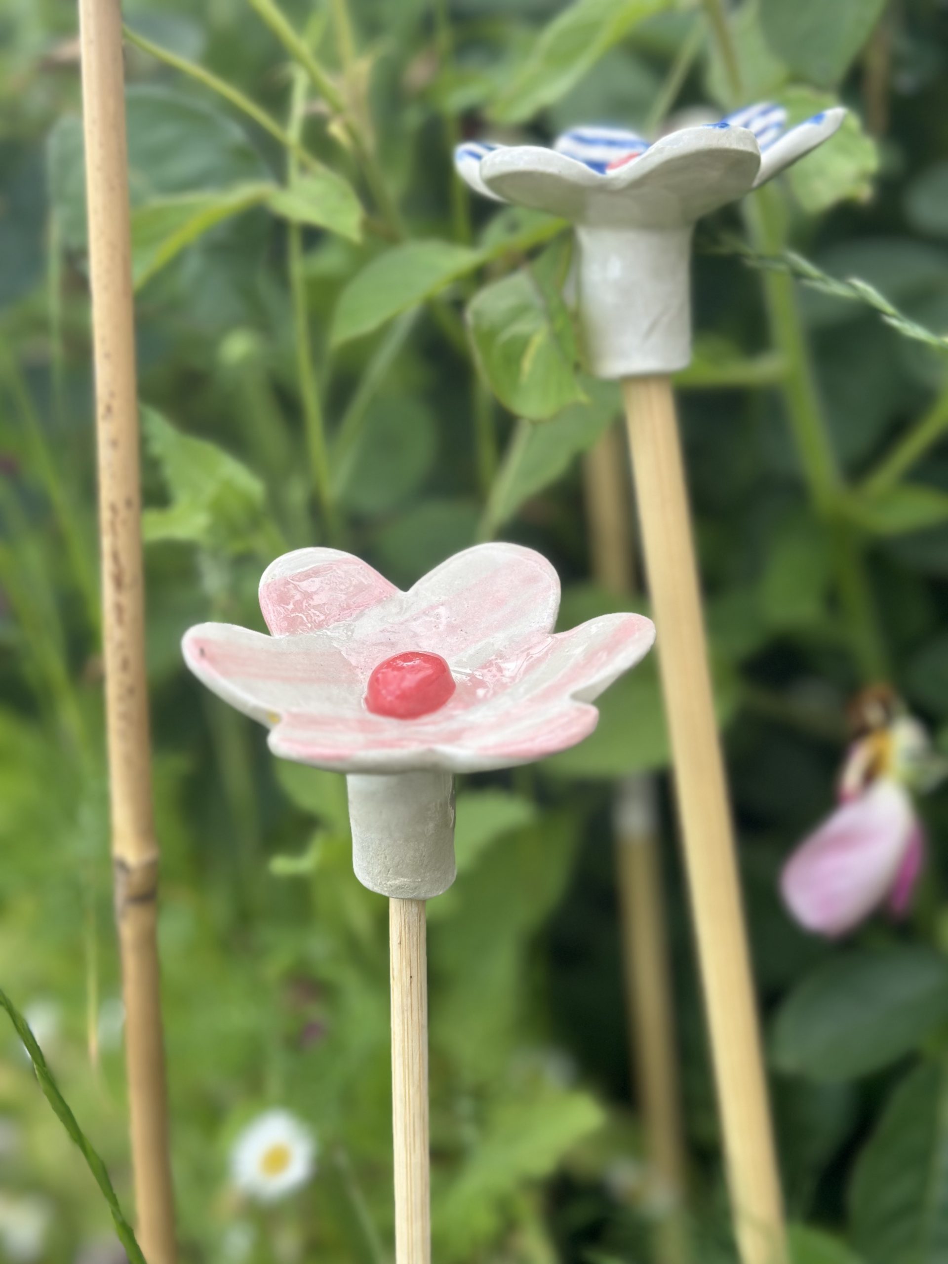 Die Bienentränke passen gut auf kleine Holz-, Bambus- oder Metallstäbe, die dann zwischen deinen Blumen im Beet stecken. Giesse sie einfach mit, wenn du deine Blumen giesst. Durch die Vertiefung steht dann ein bisschen Wasser in der Blüte, so dass die Insekten gut daraus trinken können. Damit sie nicht ertrinken haben die Bienentränken einen erhöhten Stempel in der Mitte.