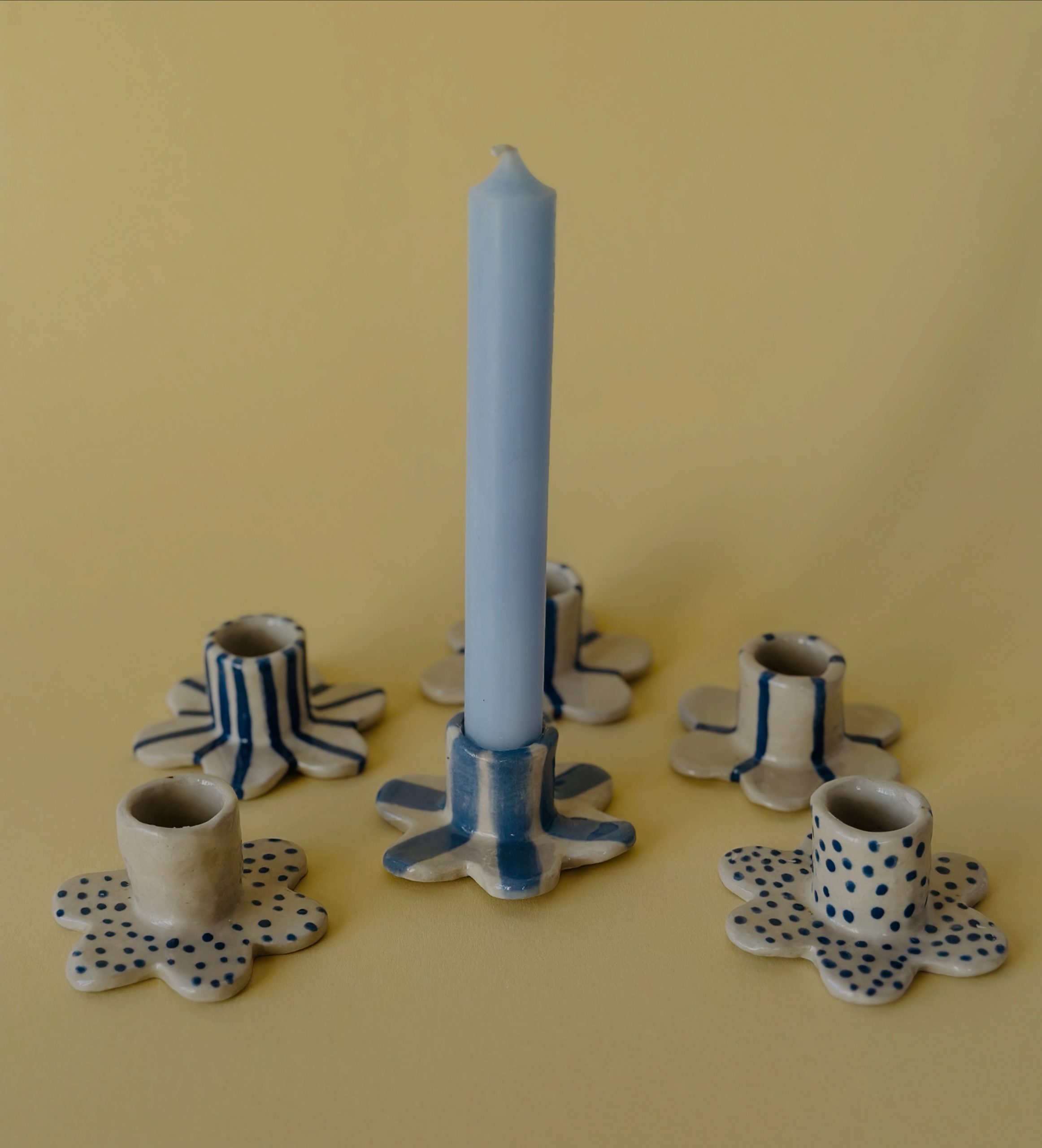 Schlichte handgetöpferte Kerzenständer aus hellem Ton, mit blauer Engobe bemalt, klar glasiert.