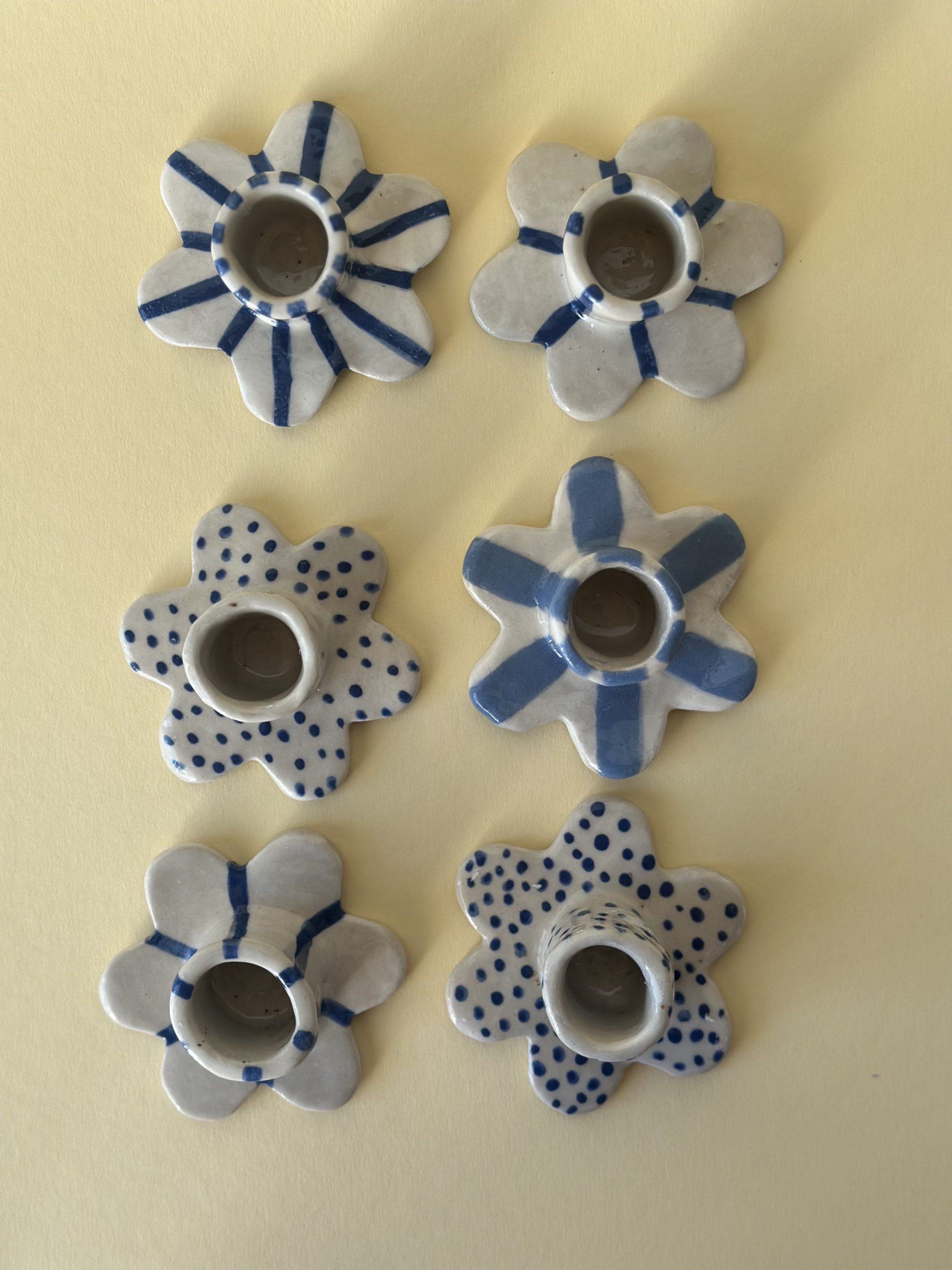 Kleine Kerzenständer in Blumenform Schlichte handgetöpferte Kerzenständer aus hellem Ton, mit blauer Engobe bemalt, klar glasiert. Als Deko auf dem Tisch, kleines Geschenk… Maße: Durchmesser ca. 7,5 cm Höhe ca. 4 cm