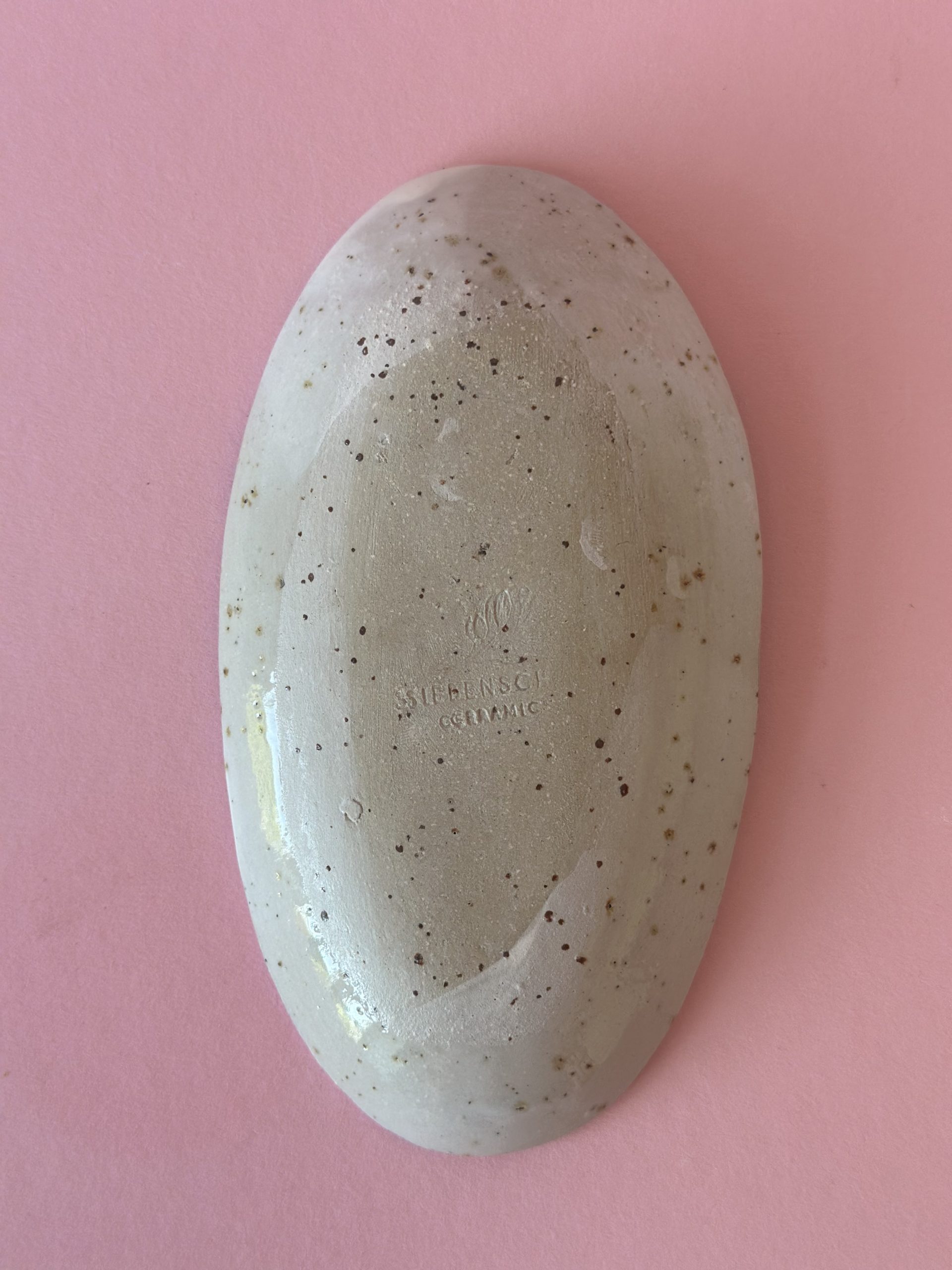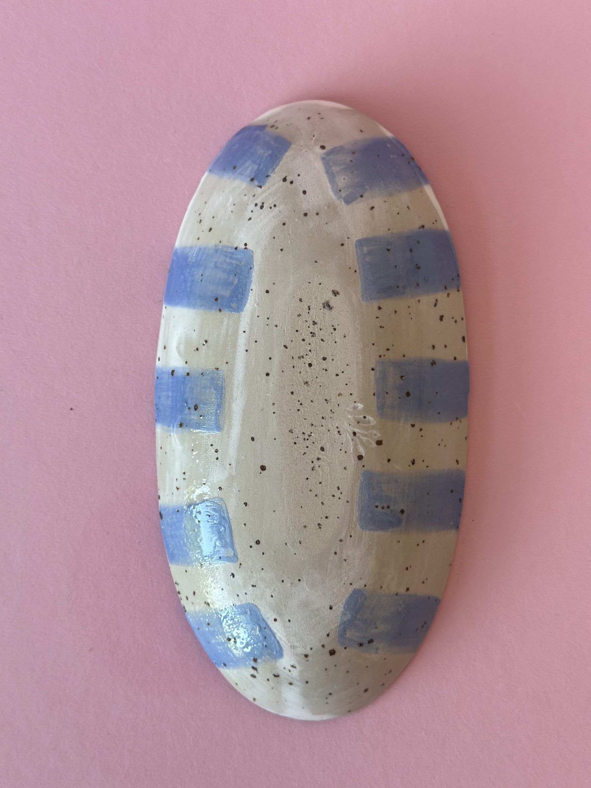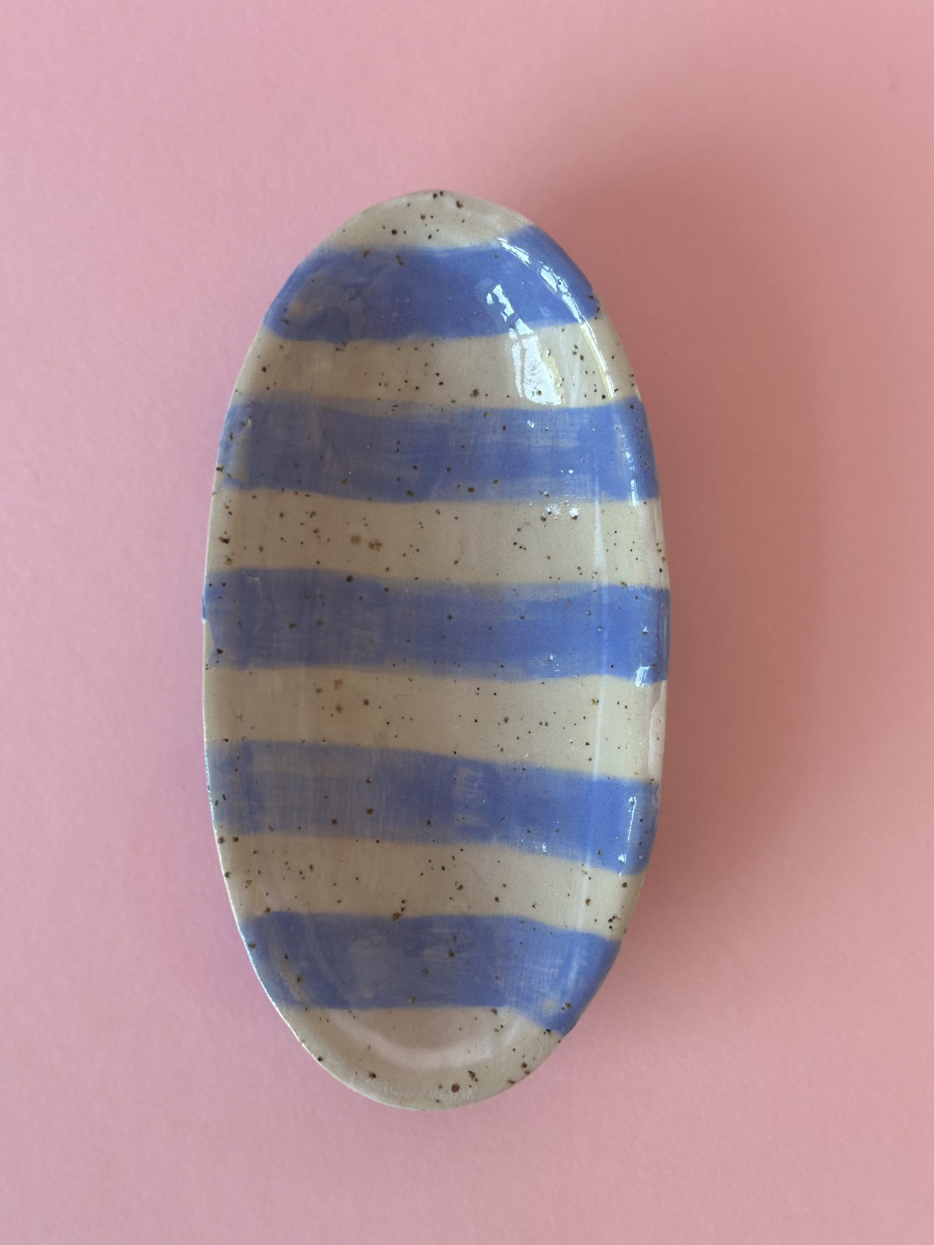Dieses ovale Schälchen habe ich von Hand getöpfert, mit hellblauen Streifen bemalt und anschliessend transparent glasiert.