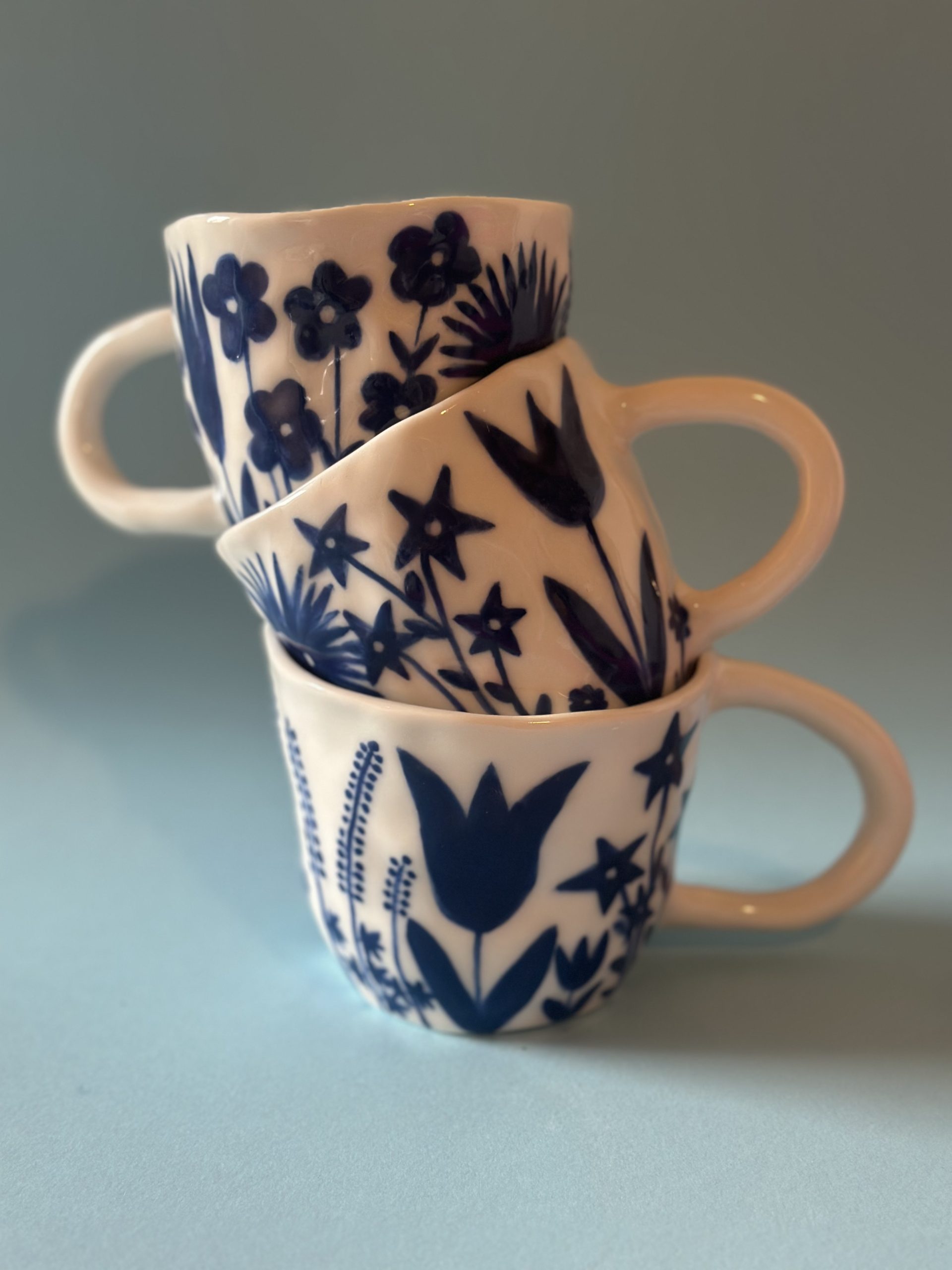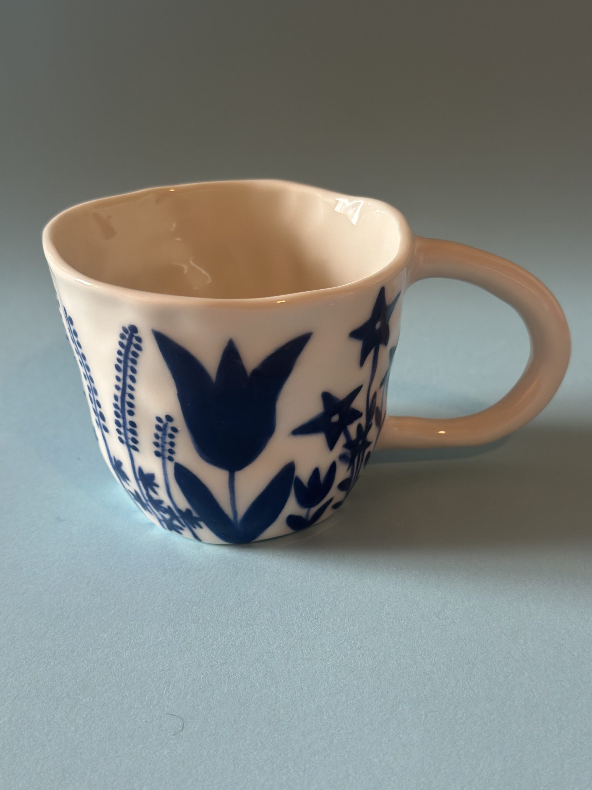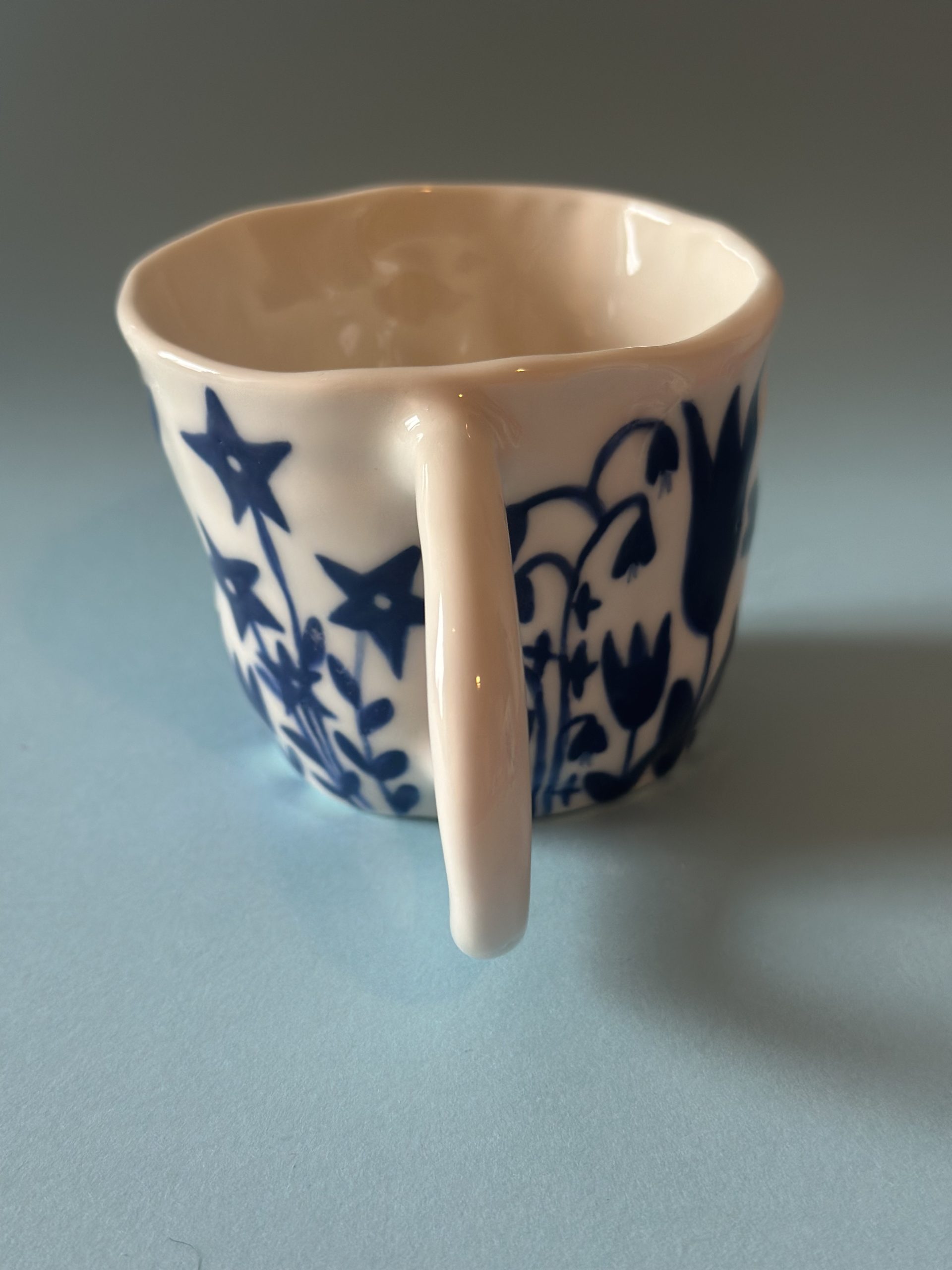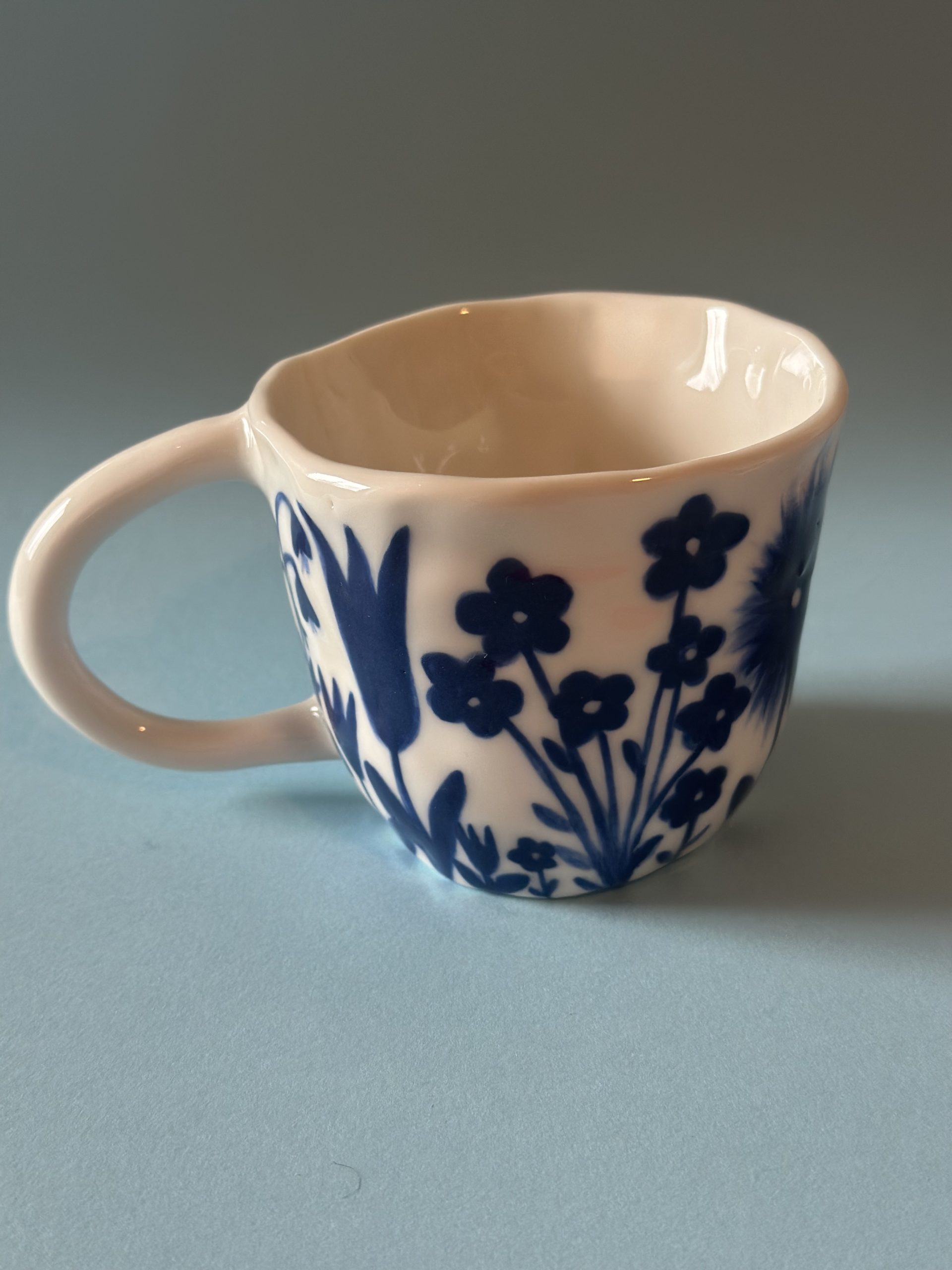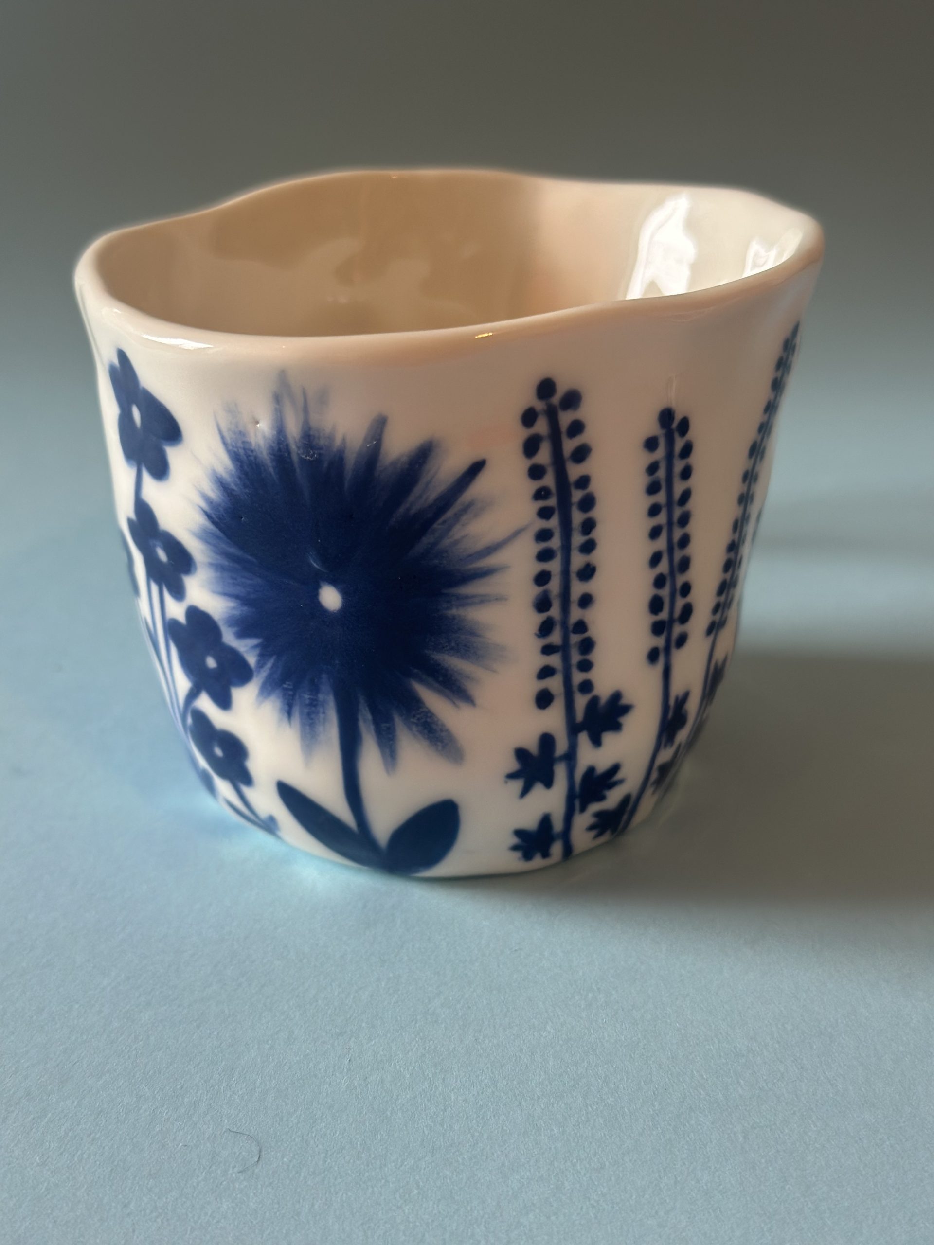 Diese Porzellantasse habe ich von Hand aufgebaut und aufwendig mit meinem blauem Blumenmuster bemalt.