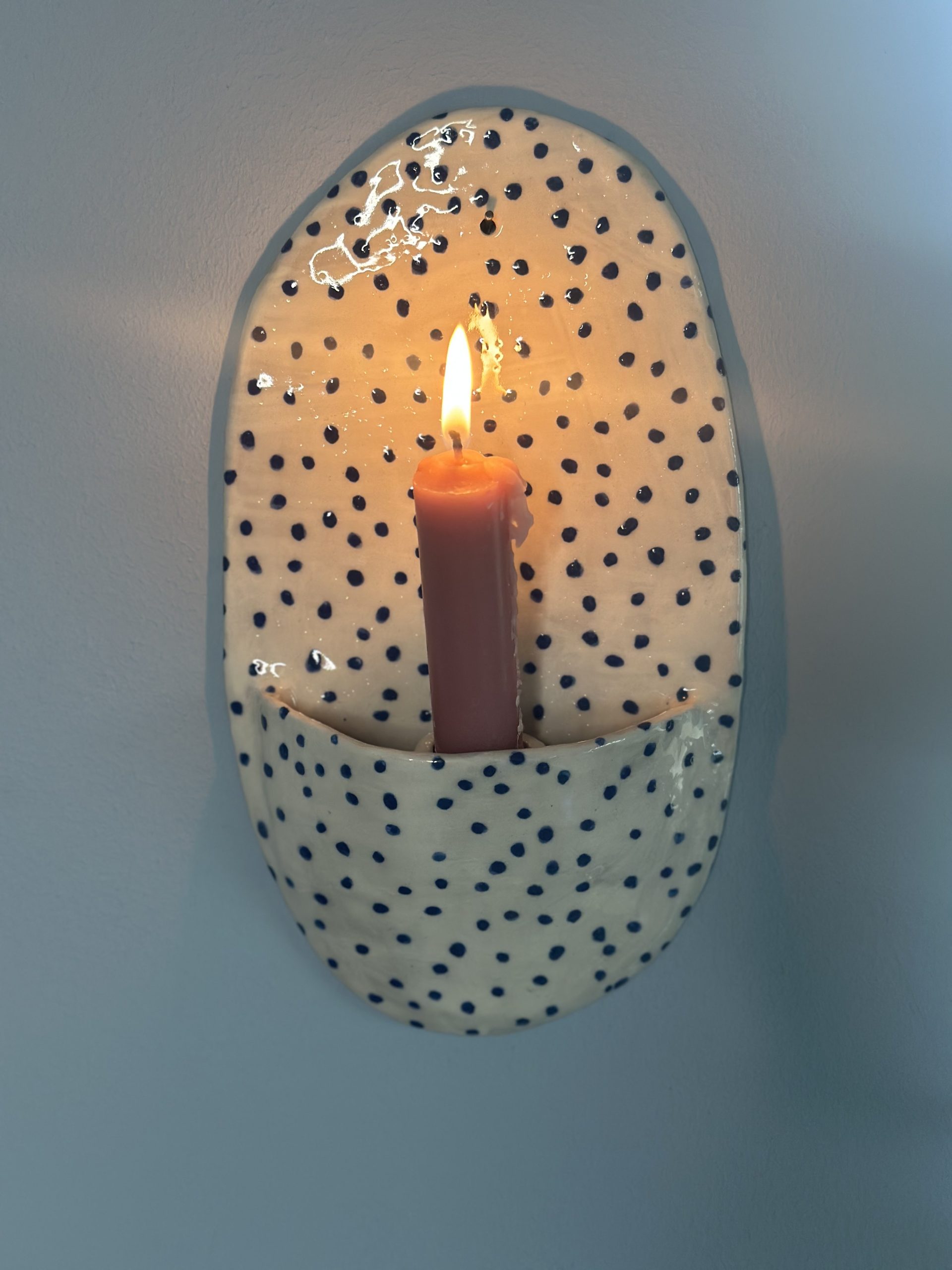 Sehr schöner Wandkerzenhalter, der sofort Gemütlichkeit von der Wand in den Raum bringt. Von Hand aus Keramik gefertigt, mit Engobe bemalt und zweifach im Töpferofen gebrannt.